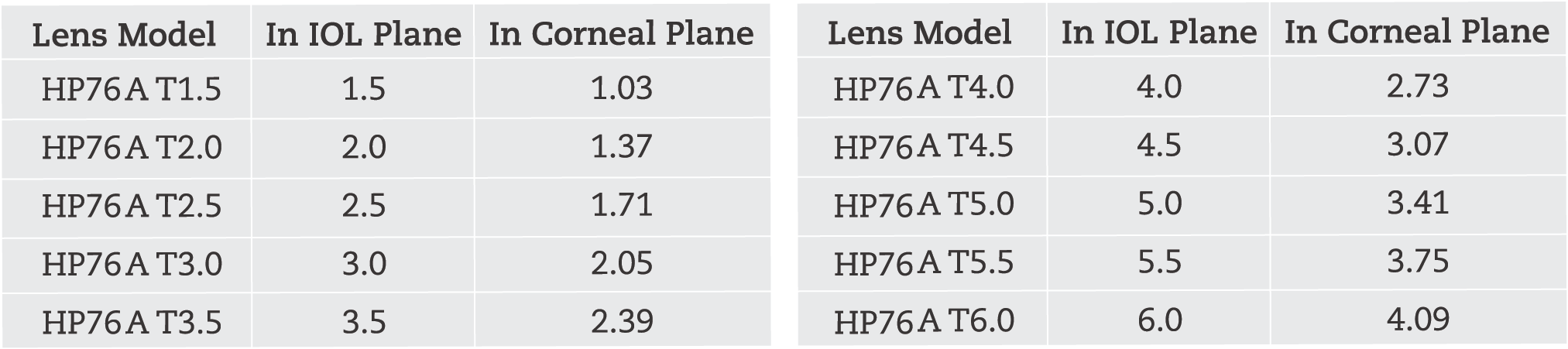 • Wide range of toric models to correct astigmatism from 1D to 6D in the corneal plane